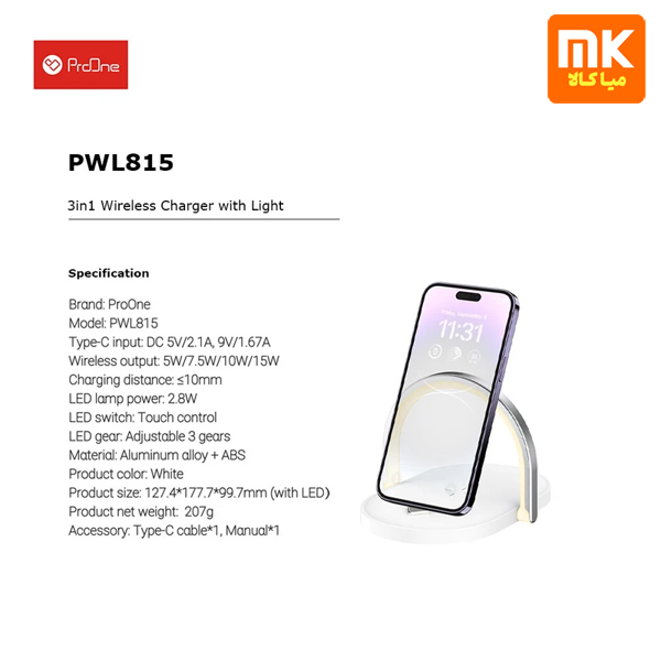 شارژر PWL815 پرووان از ترکیب آلومینیوم و پلاستیک ABS ساخته شده است. بازوی LED متحرک ۱۸۰ درجه و سطح ضد لغزش، نگه داشتن گوشی را ایمن میکند. طراحی زیبا و ابعاد ۱۲.۷ × ۱۷.۷ × ۹.۹ سانتیمتر باعث شده استفاده روی میز خواب یا میز کار آسان باشد. وزن ۲۰۷ گرم آن حمل و جابجایی شارژر را راحت کرده است.